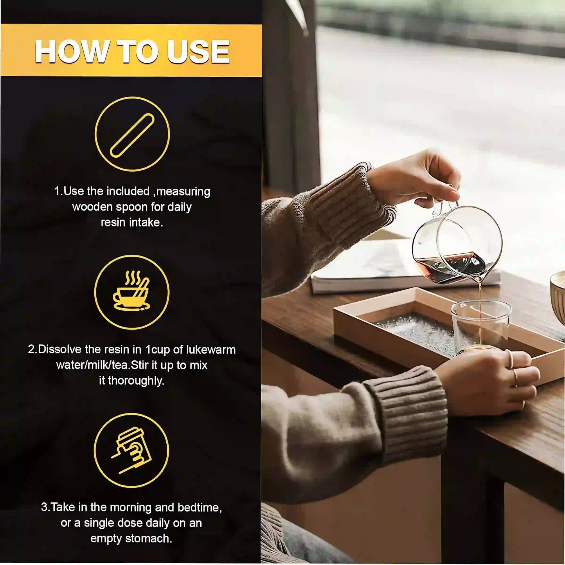 Use the included measuring spoon to take a pea-sized amount (around 300–500 mg). Dissolve it in warm water, milk, or tea and consume once daily.