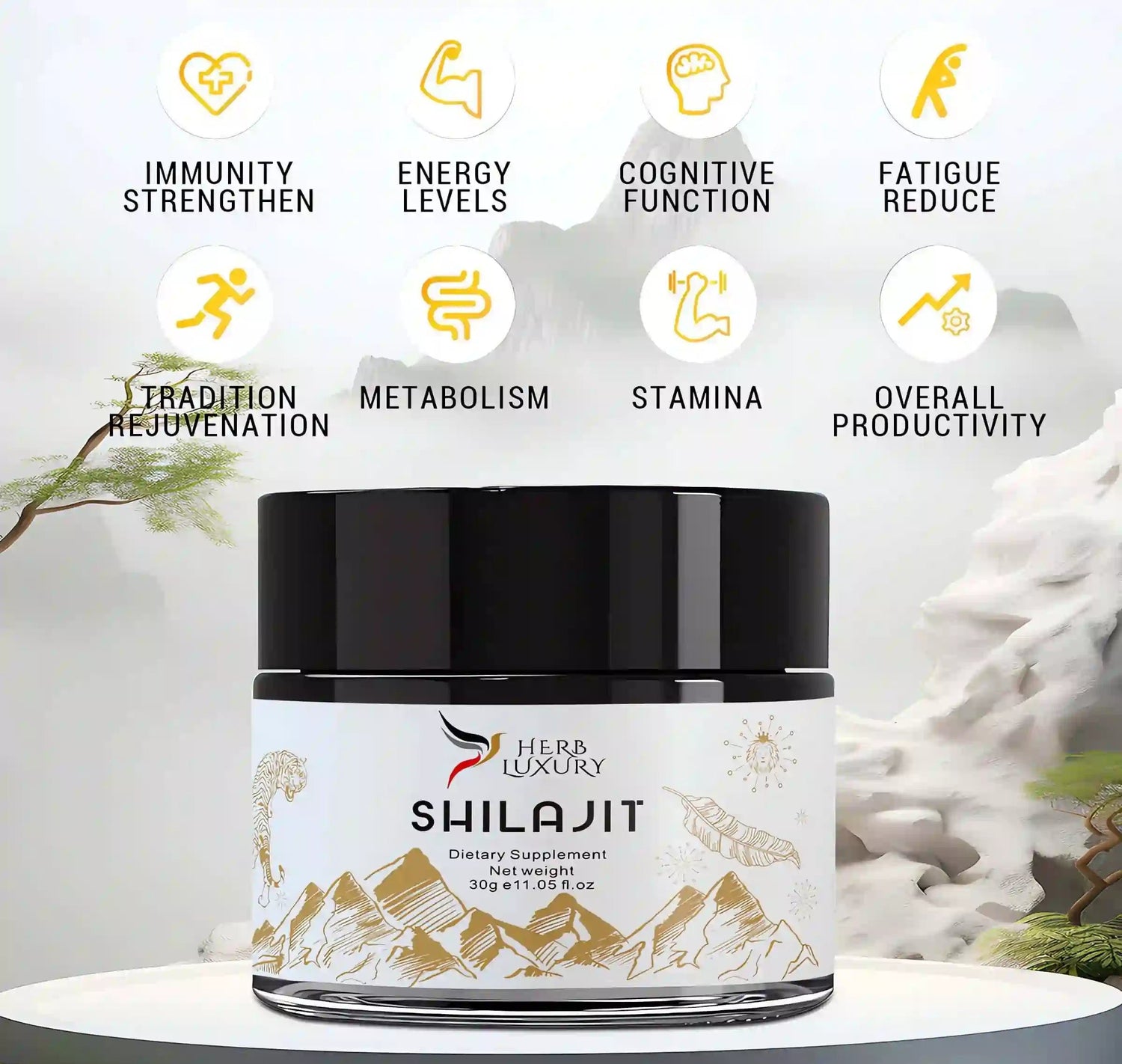 HerbLuxury Shilajit Resin is carefully harvested from the pristine Himalayan mountains and purified to preserve its natural potency. Packed with 85+ essential minerals and fulvic acid, it’s designed to naturally boost energy, stamina, mental clarity, and overall vitality. Trusted by health enthusiasts and professionals alike, it’s a premium supplement that supports immunity, recovery, and balanced wellness in your everyday life. Each jar comes with a convenient measuring spoon to ensure the perfect dose every time, making it simple to integrate this ancient natural remedy into your modern lifestyle.